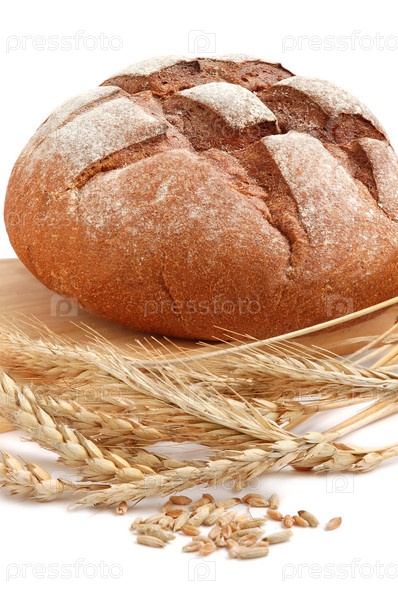 Домашний хлеб и колосья пшеницы на белом фоне