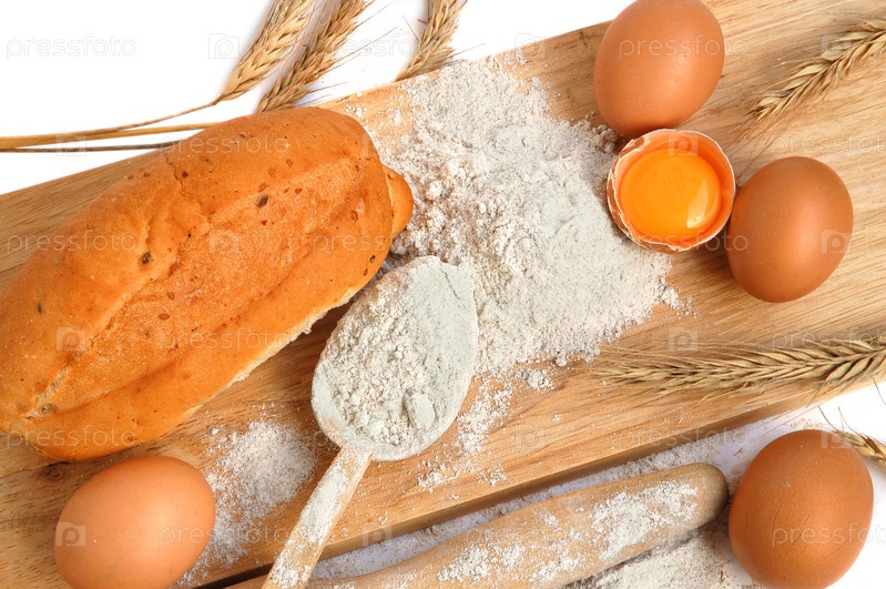 Домашний хлеб, яйца, мука и колосья пшеницы на белом фоне