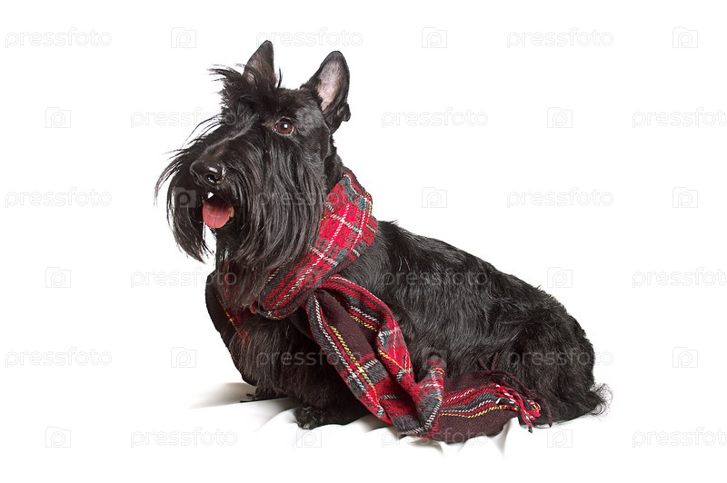 Шотландский терьер в красном шарфе на белом фоне