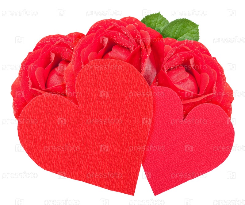 Два сердца и красные розы на белом фоне