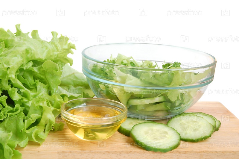 Свежий салат, растительное масло и огурцы на разделочной доске на белом фоне