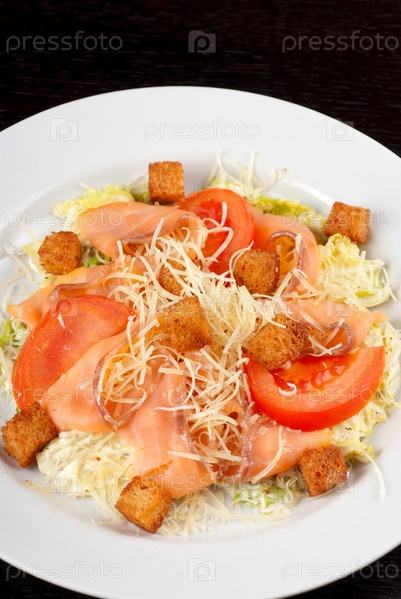 Салат с овощами, лососем и сухариками