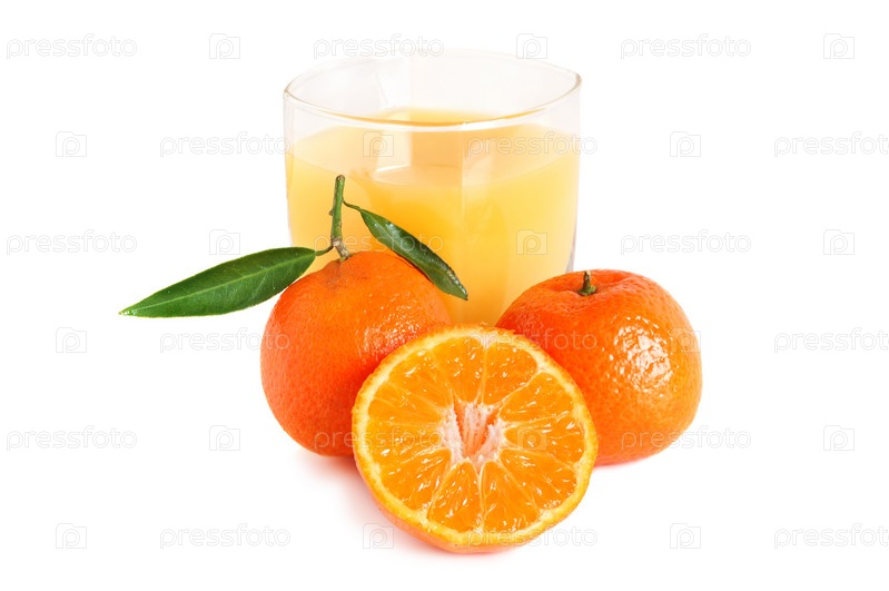 Свежие мандарины и стакан сока на белом фоне