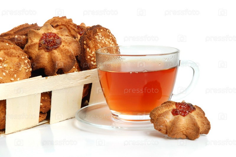 Чай и печенье в корзинке на белом фоне