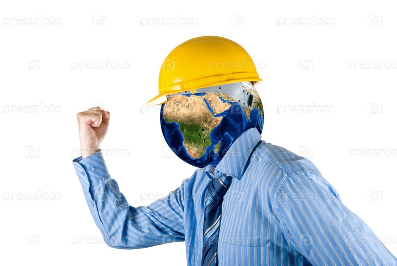Молодой человек в каске и с земным шаром вместо головы на белом фоне