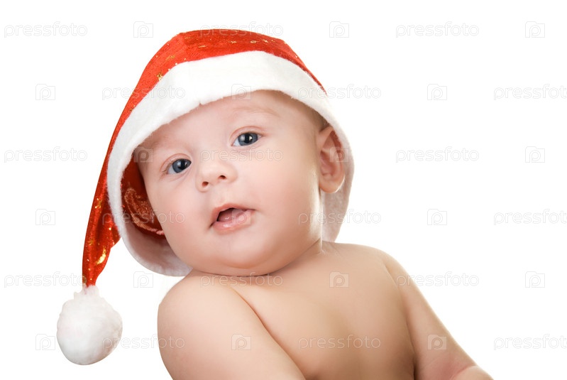 Портрет малыша в новогоднем колпаке на белом фоне