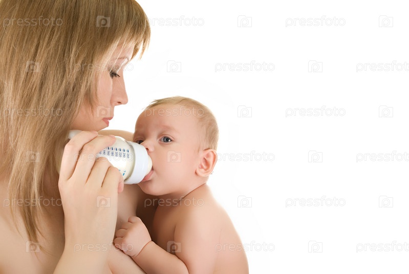 Портрет матери, кормящей ребенка, на белом фоне