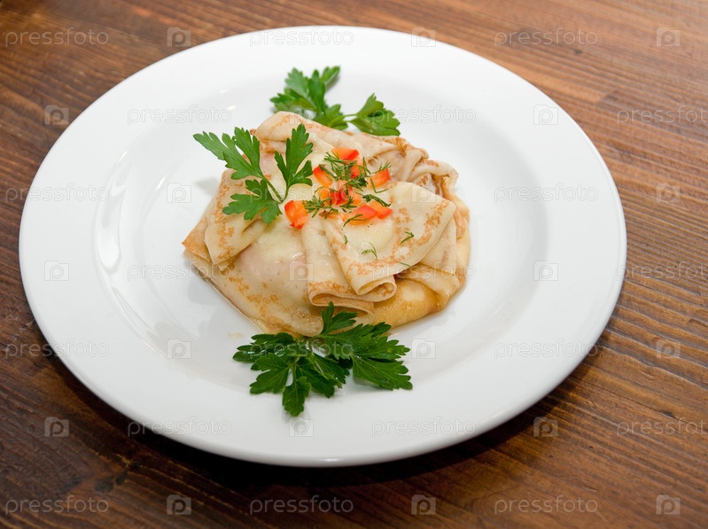 Блинчики с зеленью на тарелке