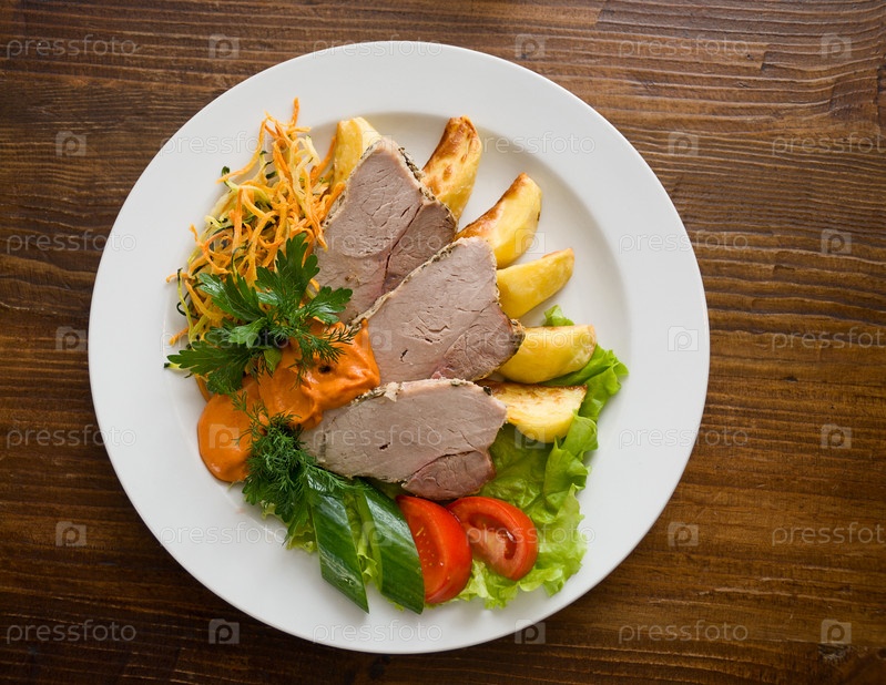 Мясо с овощами в тарелке на столе