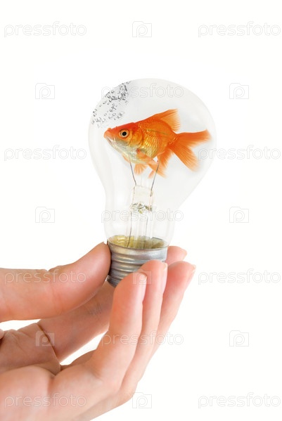 Золотая рыбка в лампочке на белом фоне