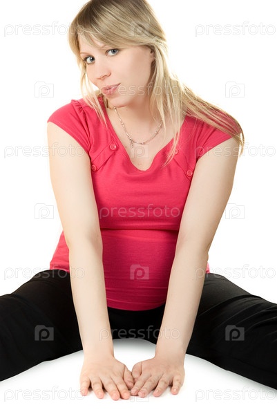 Счастливая беременная женщина, сидящая на белом фоне