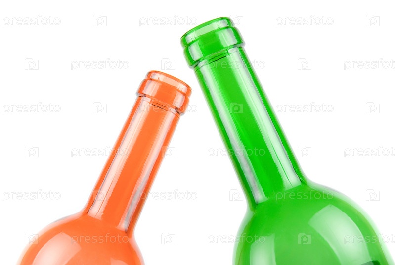 Зеленая и оранжевая бутылки на белом фоне