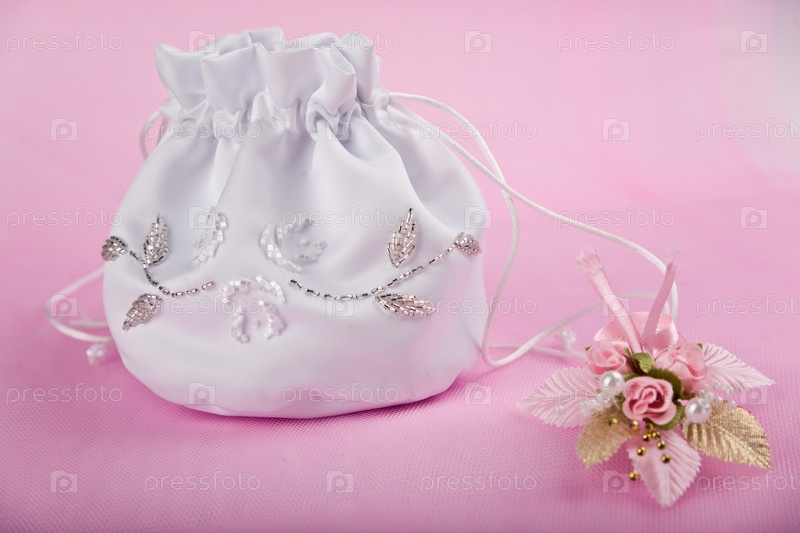 Сумочка невесты и бутоньерка на розовом фоне