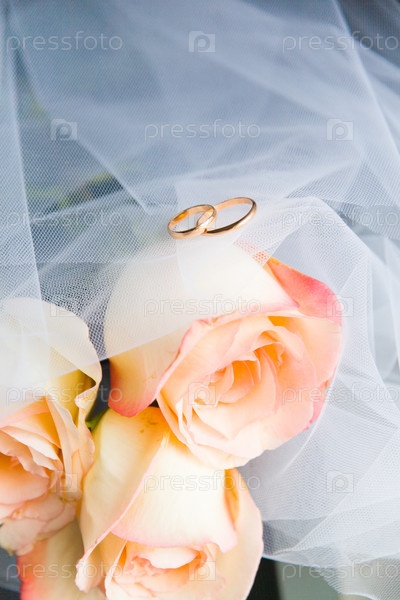 Обручальные кольца, букет роз и белая вуаль