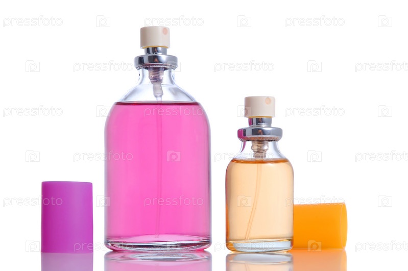 Туалетная вода в стеклянных бутыльках. Изолированные на белом фоне