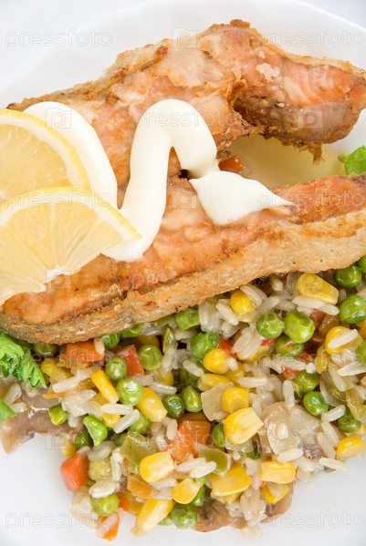 Блюдо из красного риса, овощей и рыбы на белом фоне