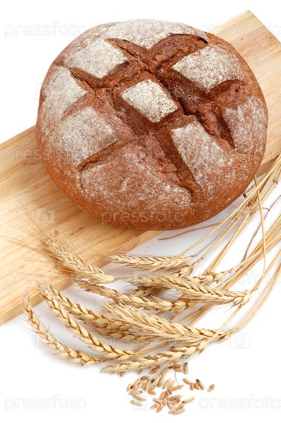 Домашний хлеб на деревянной доске и колосья пшеницы. Изолированные на белом фоне