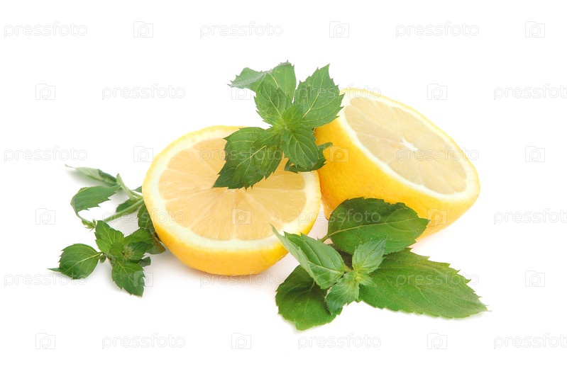 Половинки лимона с листьями мяты. Изолированные на белом фоне
