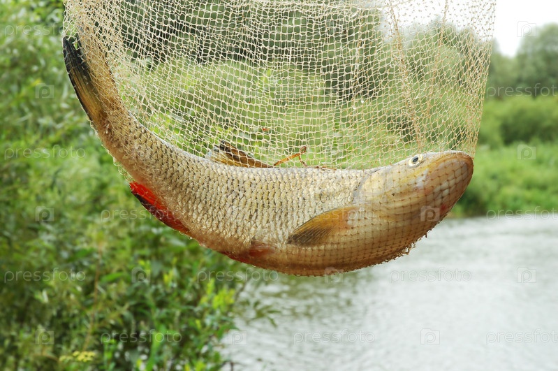 Крупная рыба в рыболовной сети на фоне реки
