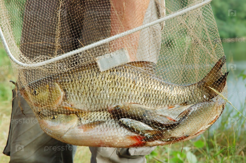 Рыбак держит сеть с рыбами на фоне реки