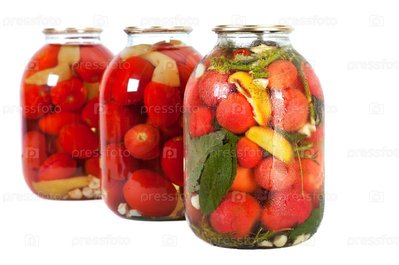 Консервированные красные помидоры в стеклянных банках на белом фоне