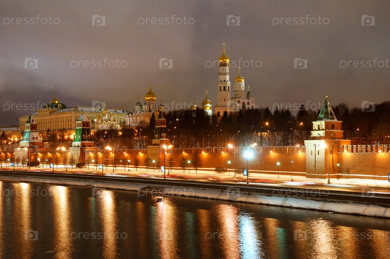 Панорама Московского Кремля и Москвы-реки в зимнюю ночь