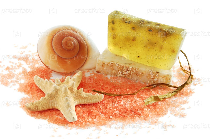 Розовая соль, мыло ручной работы и морская звезда на белом фоне