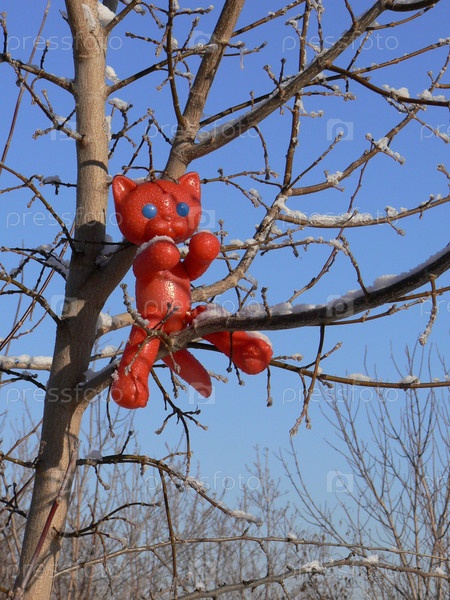 Игрушечный красный котенок на дереве