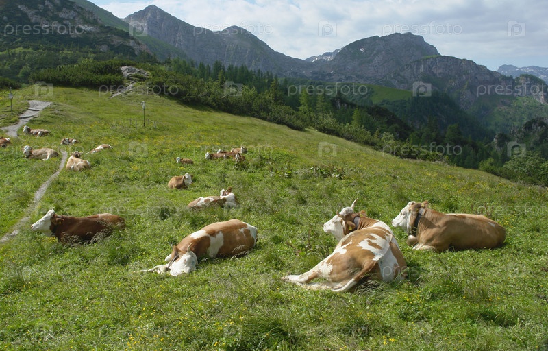 Стадо коров на лужайке в Баварских Альпах