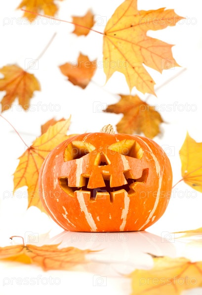 Фонарь Джека и осенние листья, изолировано на белом
