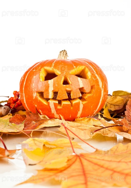 Фонарь Джека и осенние листья, изолировано на белом