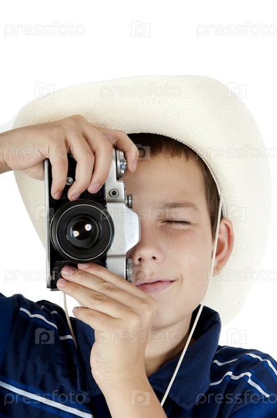 Мальчик в белой шляпе фотографирует, держа камеру перед собой