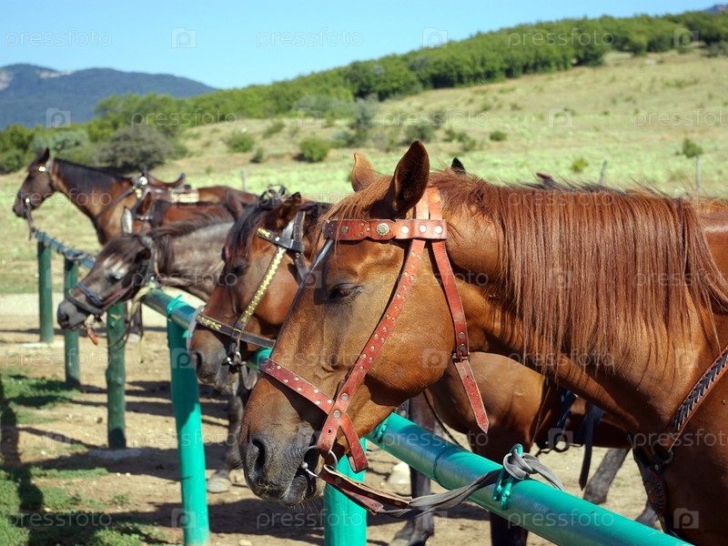 Лошади стоят в конюшне под открытым небом на фоне голубого неба и зеленой луга
