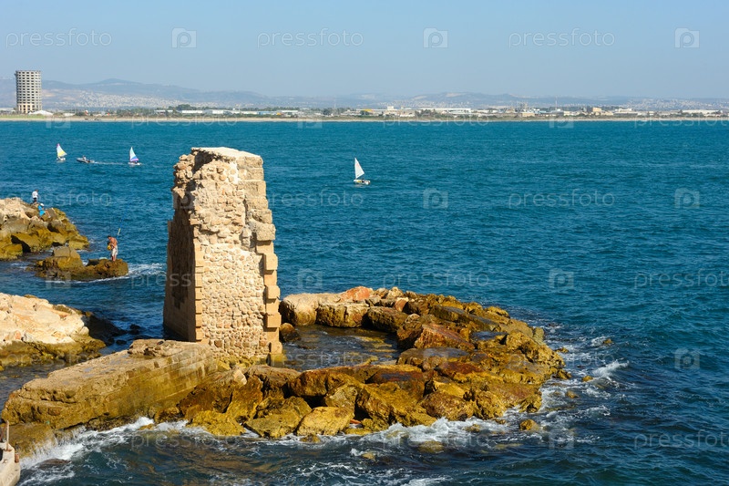 Остатки крепостных стен Акко на берегу Средиземного моря