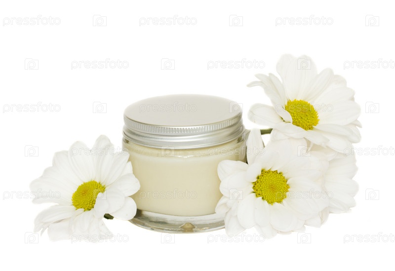 Баночка с кремом и цветок ромашки, изолированы на белом фоне