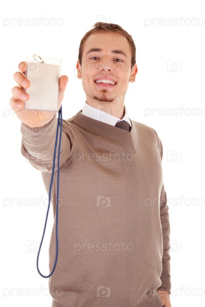 Молодой человек с визитной карточкой, изолированный на белом фоне
