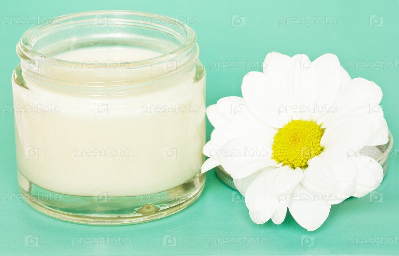 Открытая баночка с кремом и цветок ромашки на зеленом фоне