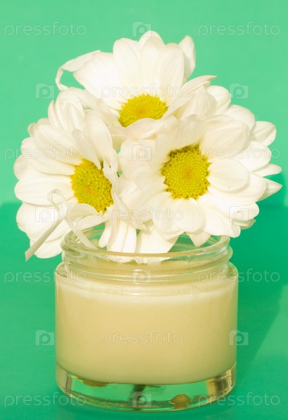 Открытая баночка с кремом и цветок ромашки на зеленом фоне