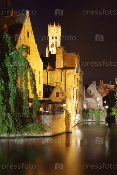 Ночной вид на канал и дома в Брюгге, Бельгия