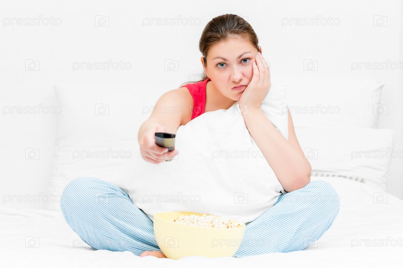 Девушка в пижаме с пульт дистанционного управления