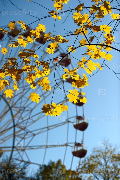 Ветки осеннего клена на фоне неба и колеса обозрения
