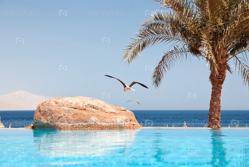 Чайка летит над бассейном на берегу моря