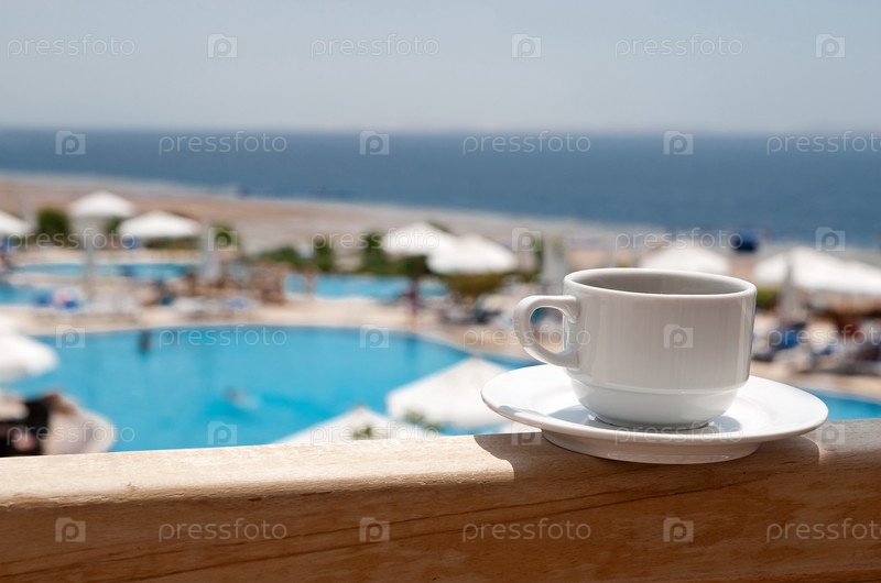 Чашка кофе на балконе с видом на бассейн, пляж и море