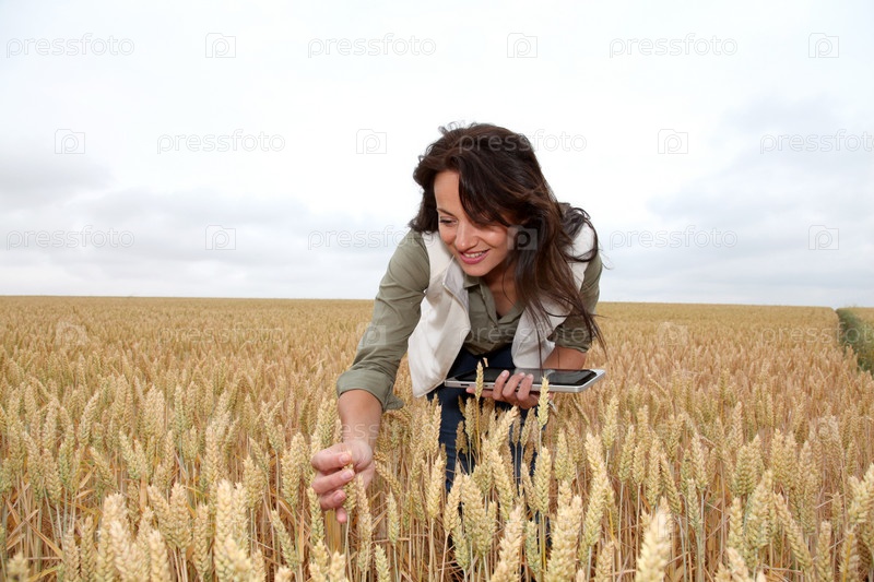 Женщина с планшетом на поле пшеницы