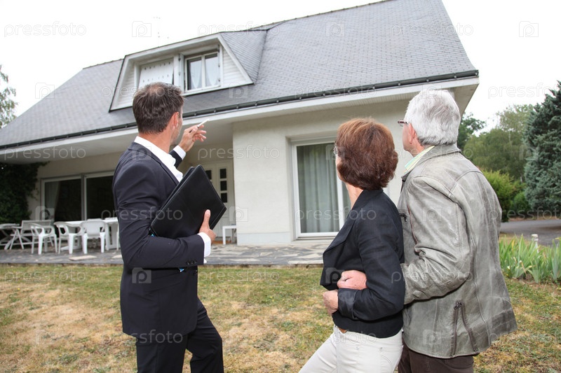 Агент недвижимости с парой у дома