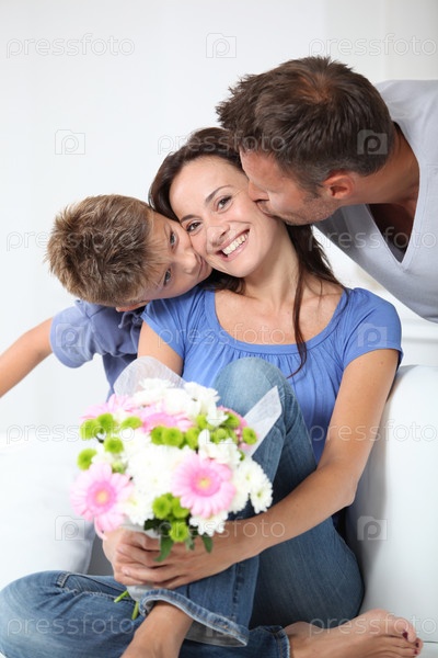 Мужчина и мальчик поздравляют женщину