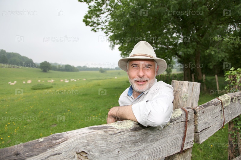 Фермер, опираясь на сельхозугодья забор