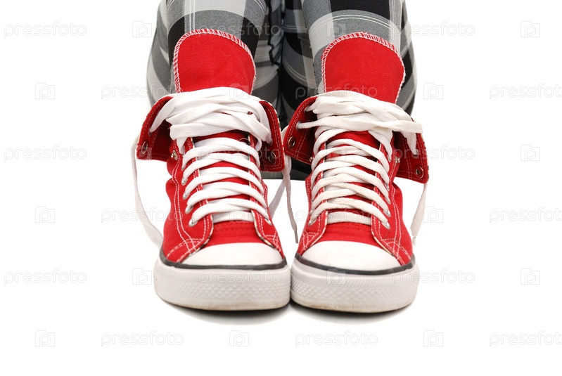 Красные кроссовки, клетчатые леггинсы. Изолированные на белом