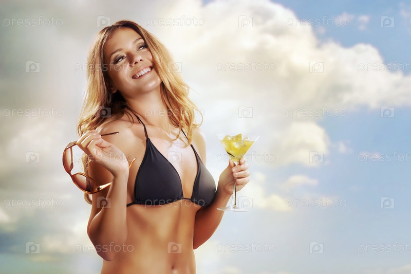 Девушка на пляже с бокалом коктейля в тропиках