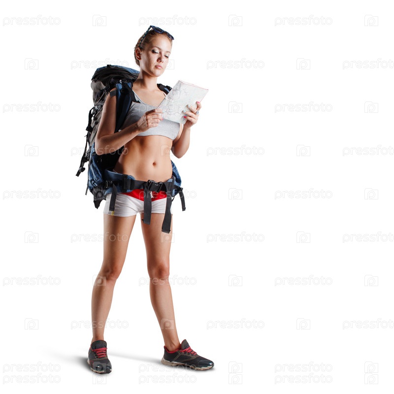 Турист женщина, изолированные на белом фоне стоя в полный рост